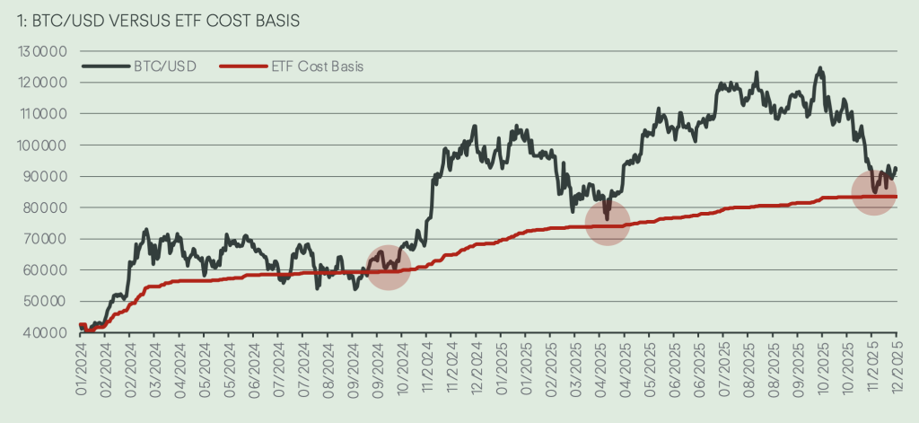 “Across 2024/2025, Bitcoin has exhibited the same repeatable pattern: price breaks to new all-time highs, corrects sharply, and then finds support almost perfectly at its ETF investor cost basis before beginning the next expansion.”