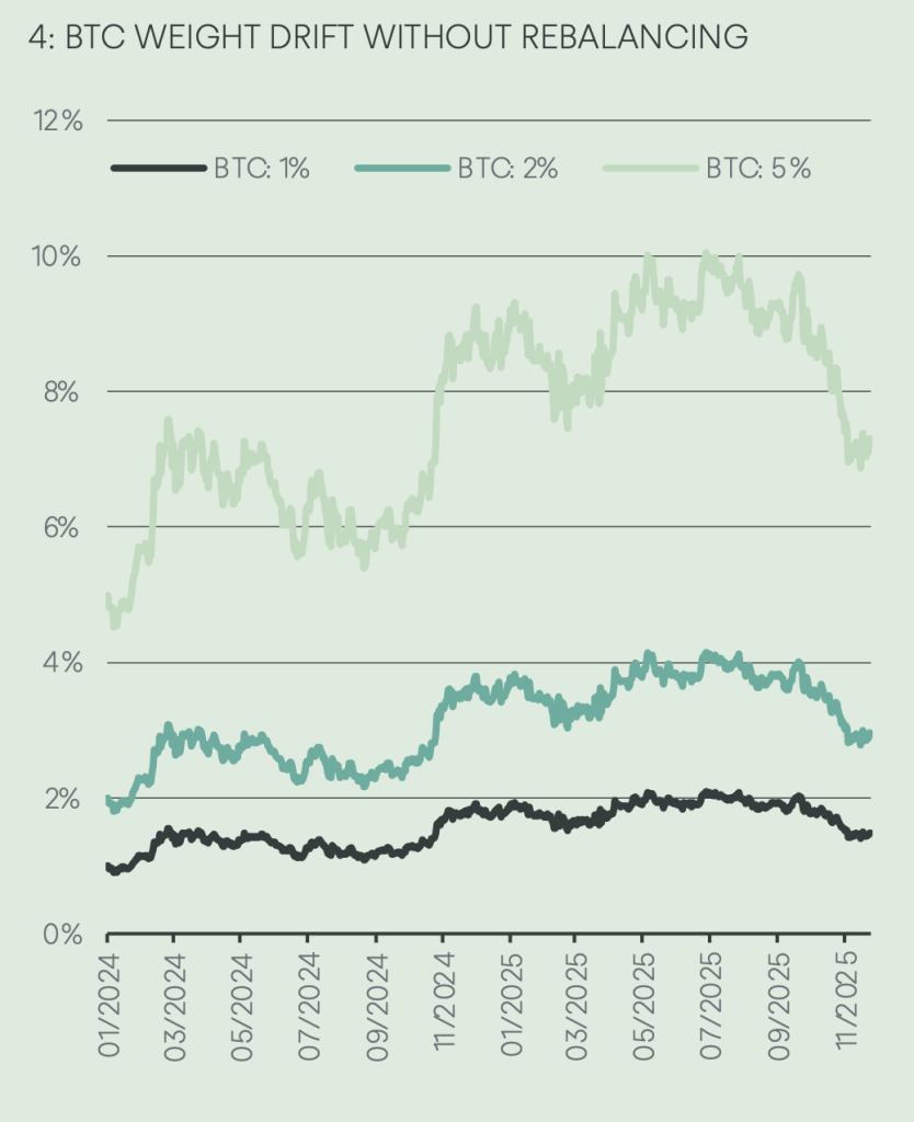 “Without rebalancing, a modest 2% Bitcoin allocation drifts to 6.2% in less than 180 days during these cycles. A 5% allocation drifts dangerously close to double-digit.”