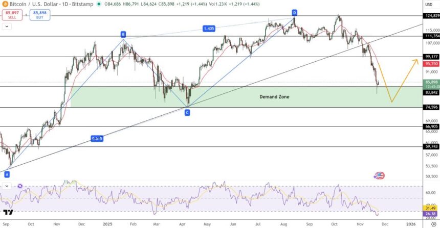 Bitcoin is attempting to steady after weeks of heavy selling pushed the price into the high-conviction $83,000–$84,000 demand zone, a region that has repeatedly attracted institutional accumulation throughout the year.