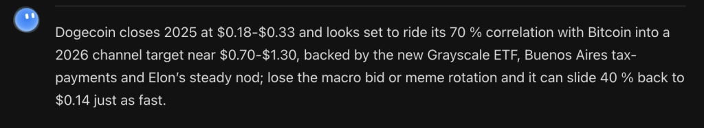 Kimi AI predicts Dogecoin will close 2025 at a minimum of $0.18. With the Grayscale ETF and steady support from Elon Musk, the AI expects Dogecoin to reach a new all-time high in 2026 between $0.70 and $1.30. Kimi also believes this could mark the start of a new meme rotation.