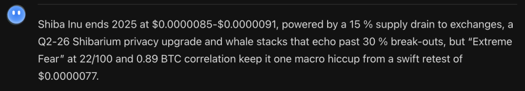The AI predicts Shiba Inu will end 2025 near its current price, as the coin continues leaving exchanges, which could cause a supply shock once the Shibarium privacy upgrade becomes ready in 2026.