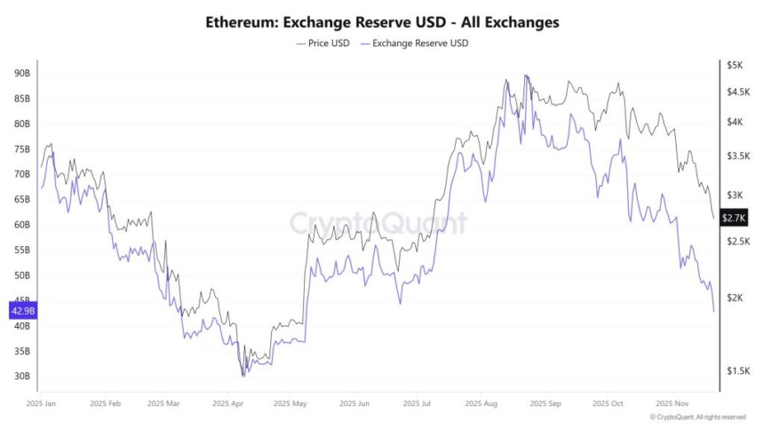 This accumulation coincides with a meaningful drop in ETH available on exchanges. CryptoQuant data shows exchange reserves falling to 15.6 million ETH, the lowest level in more than four years. Fewer coins on exchanges often translate into thinner sell-side liquidity and a reduced ability for the market to absorb additional downward pressure.