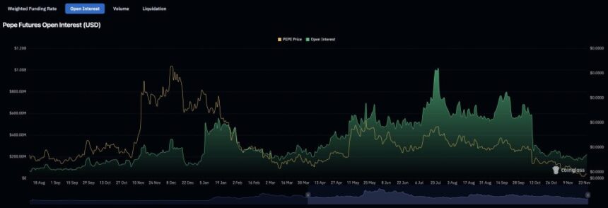 This comes as open interest in PEPE futures sinks to just $165 million, far below its $1 billion peak in July.