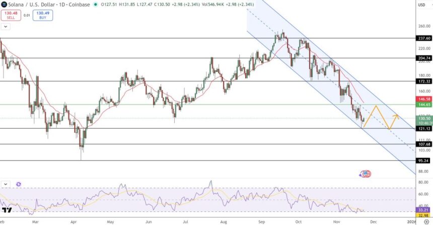 However, failure to defend $121 would activate the death-cross narrative more aggressively, exposing Solana to deeper downside into early December.