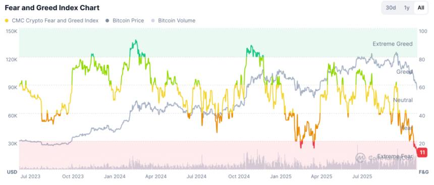 Fear is dominating today’s trading across the crypto market as the CMC Crypto Fear and Greed Index sits at 11, the lowest reading since its launch, while Bitcoin is trading around $83,000 after retreating sharply from recent six-figure levels.
