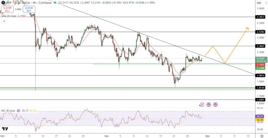 XRP’s latest rebound began after the market defended the $2.14 demand zone, an area repeatedly tested throughout November. The 4-hour chart shows price pressing into a descending trendline, forming a symmetrical triangle pattern. This structure reflects compression, a period when the market pauses before a larger directional move.