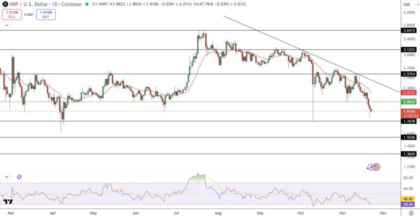XRP has broken below the critical $2 threshold, placing renewed focus on the narrow $1.76–$1.80 band that now serves as the market’s final structural support. With momentum fading and sellers retaining control of the trend, XRP’s next moves will determine whether this area becomes a launchpad for recovery or the start of a deeper breakdown.